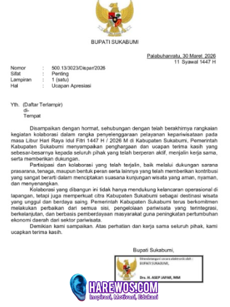 Harewos.Com – Jum’at, 06 April 2026 – Pemerintah Kabupaten Sukabumi menyampaikan ucapan terima kasih dan penghargaan setinggi-tingginya kepada seluruh pihak yang telah berkontribusi dalam kelancaran pelayanan pariwisata selama libur Idul Fitri 1447 H/2026 M. Informasi ini dipublikasikan melalui akun resmi Gurilapss Dispar Kabupaten Sukabumi sebagai bentuk komitmen transparansi dan apresiasi atas kerja sama lintas sektor.