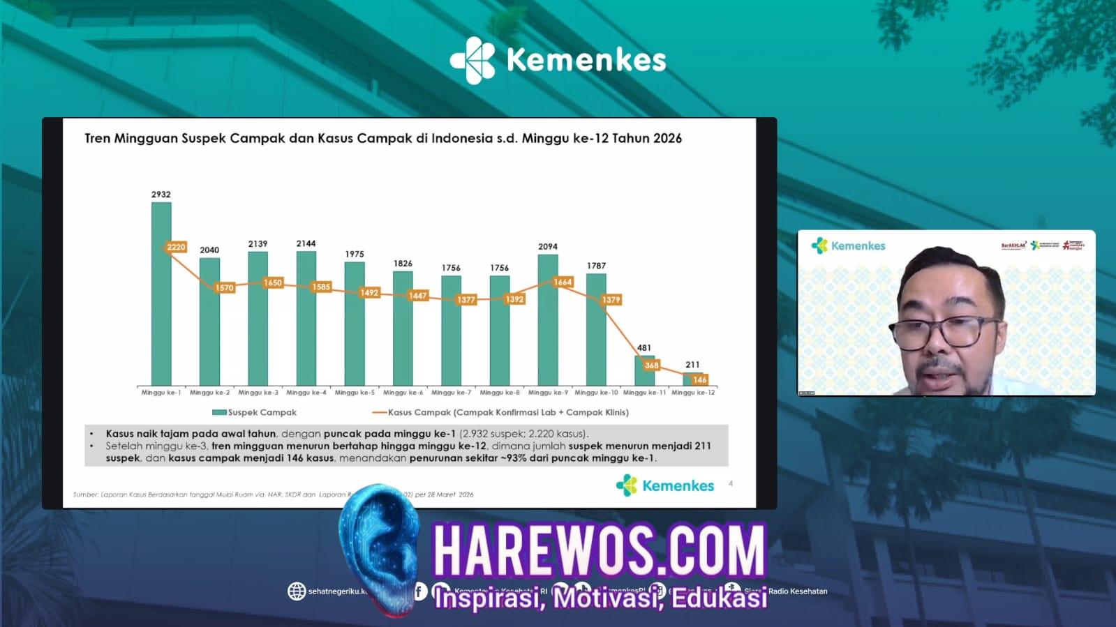 “Pada minggu ke-12 epidemiologi, itu kasusnya menurun menjadi 146 kasus dibandingkan dengan minggu ke-11. Minggu ke-11, 368 kasus. Dan kalau kita lihat pada minggu pertama tahun 2026 jumlah kasusnya itu 2.220. Jadi ketika kita membandingkan dari minggu pertama sampai dengan minggu ke-12, bisa kita lihat disini terjadi penurunan kurang lebih 93 persen,” kata Andi.